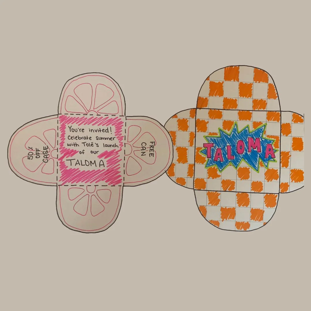 It all started from me thinking about the feeling I wanted my drink to represent. I love summertime, and especially getting to enjoy an alcoholic soda or seltzer on a sunny day. Considering the popularity of vodka sodas, I wanted to take on a tequila soda by turning a Paloma cocktail into a canned drink, with a fun, colourful, bold, yet lighthearted visual brand identity. The required brand pieces I had to design included the can, the can carrier, and an invitation to a launch party for the drink. Each one had to remain consistent to the tone and core message of Taloma by coherently displaying the same fonts, colours, and design elements in a unique manner for each medium.